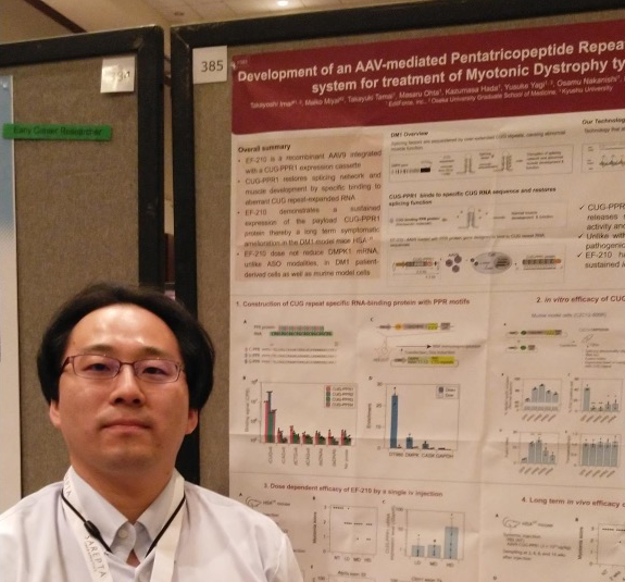 Various institutions working on neuromuscular diseases participated in WMS 2023 from all over the world, such as hospitals, universities, pharmaceutical and biotech companies. We made a poster presentation on our acheivement in our lead program EF-210, an Pentatricopeptide Repeat Protein (PPR) based treatment for Myotonic Dystrophy type 1 (DM1), and won Elsevier WMS Membership Award. We regard this award as a reflection of the high evaluation of the innovativeness and applicability of our technology in the international field.