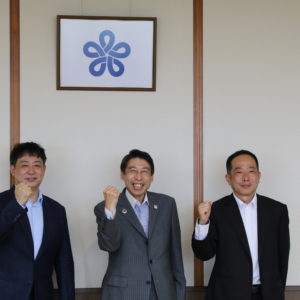 2022年7月11日、当社の代表取締役社長小野と創業者の中村崇裕九州大学大学院教授が服部誠太郎福岡県知事を表敬訪問し、田辺三菱製薬株式会社とのライセンス契約締結の報告と当社事業の説明を行いました。