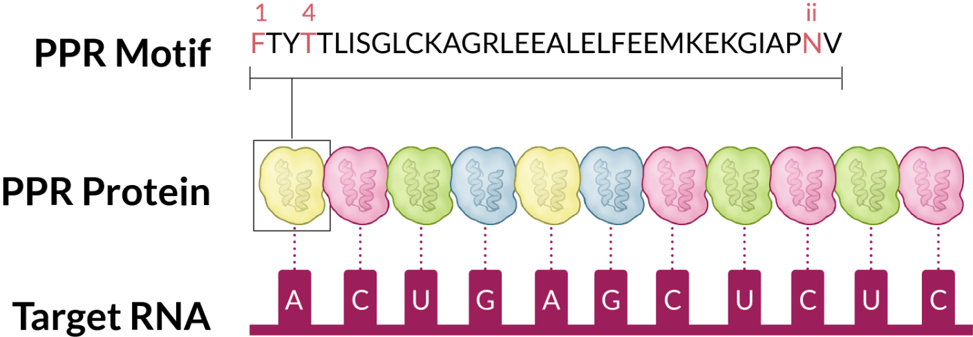 PPRタンパク質は、35個のアミノ酸残基からなるPPRモチーフと呼ばれる構造単位が連続して並んでいます。1つのモチーフはRNAの1塩基を認識・結合し、モチーフ内の3つのアミノ酸残基の組み合わせによって結合する塩基が決定されます。