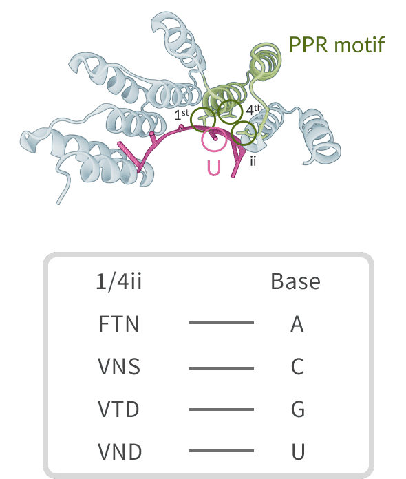 PPRタンパク質は、35個のアミノ酸残基からなるPPRモチーフと呼ばれる構造単位が連続して並んでいます。1つのモチーフはRNAの1塩基を認識・結合し、モチーフ内の3つのアミノ酸残基の組み合わせによって結合する塩基が決定されます。
